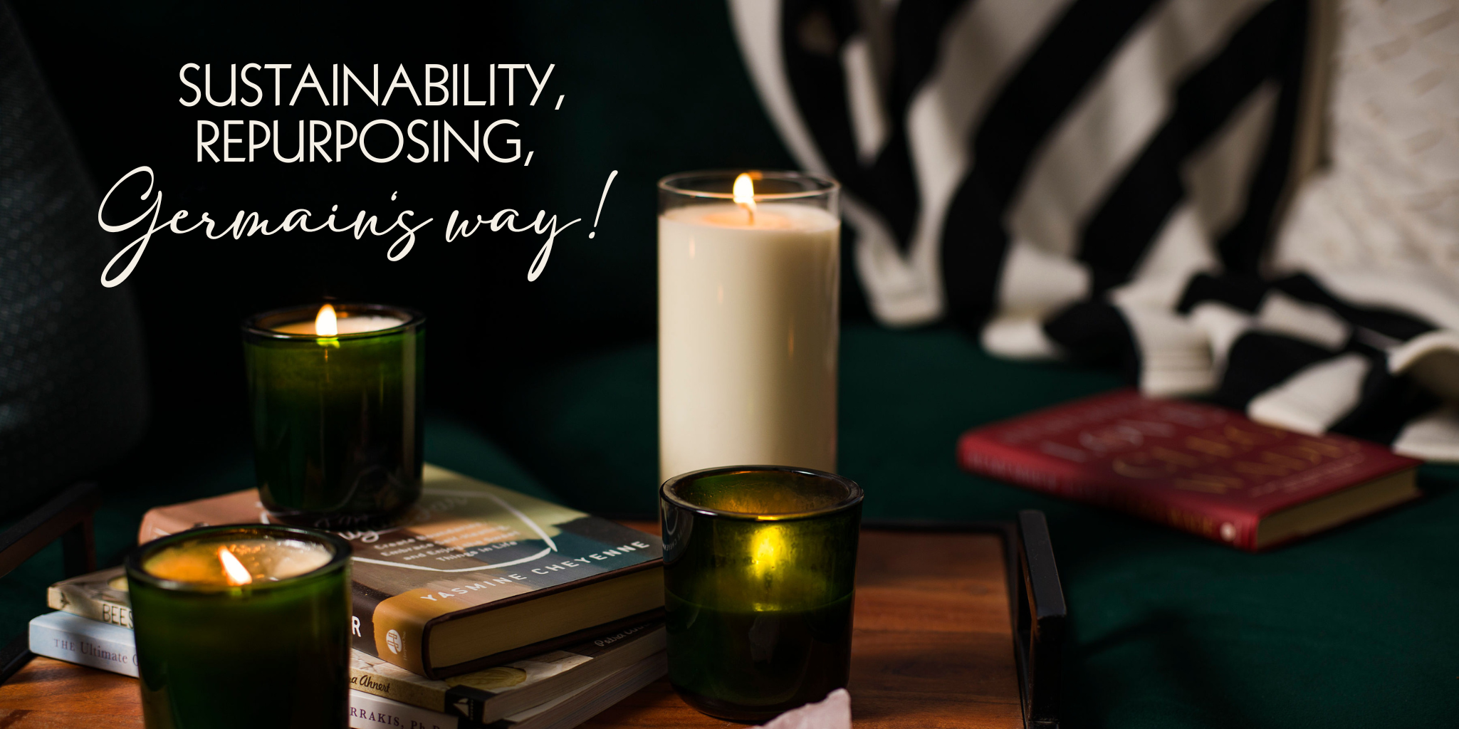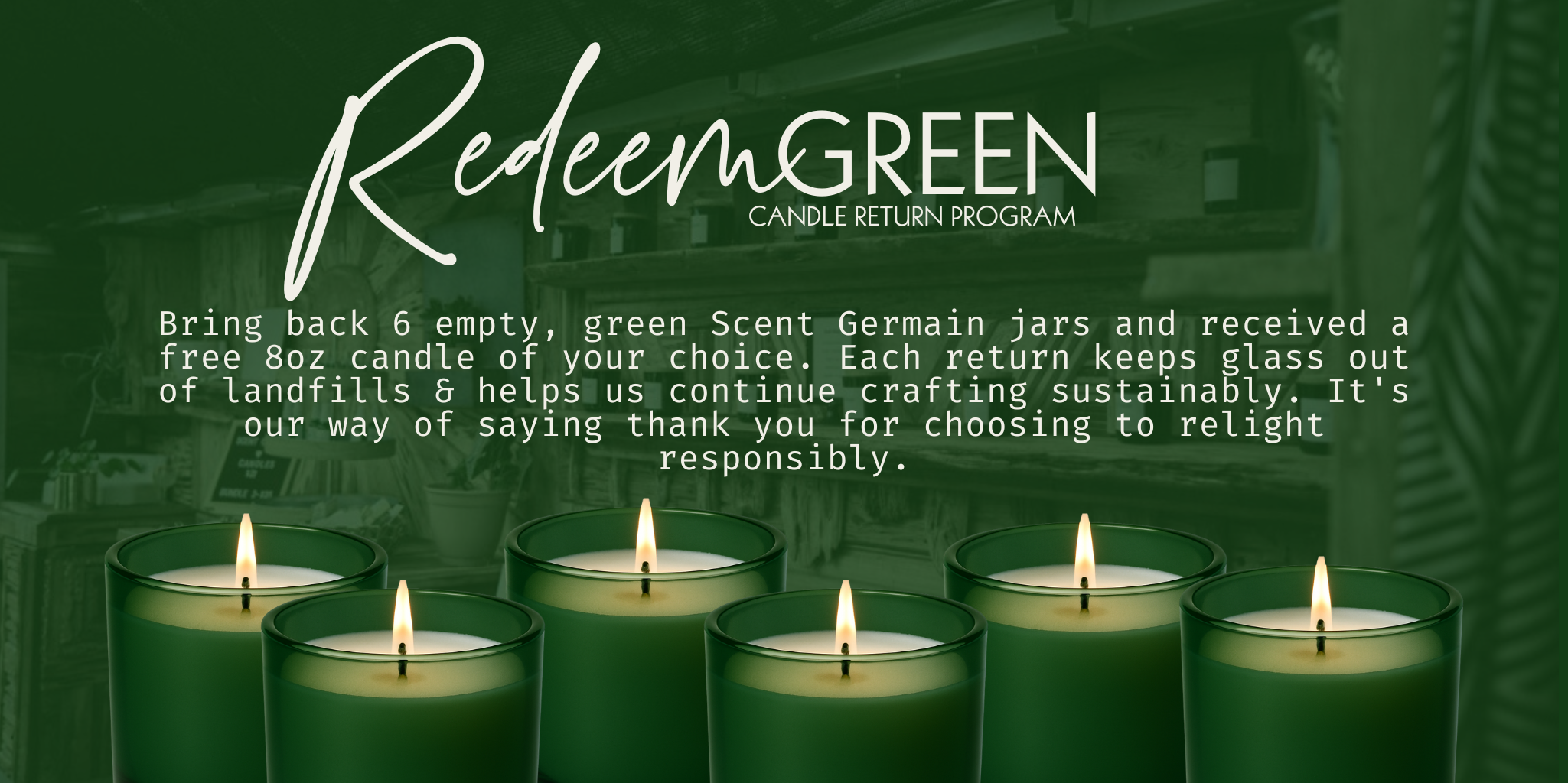 Return six empty, greenScent Germain jars&receive a free candle asathank-you for recycling with intention.